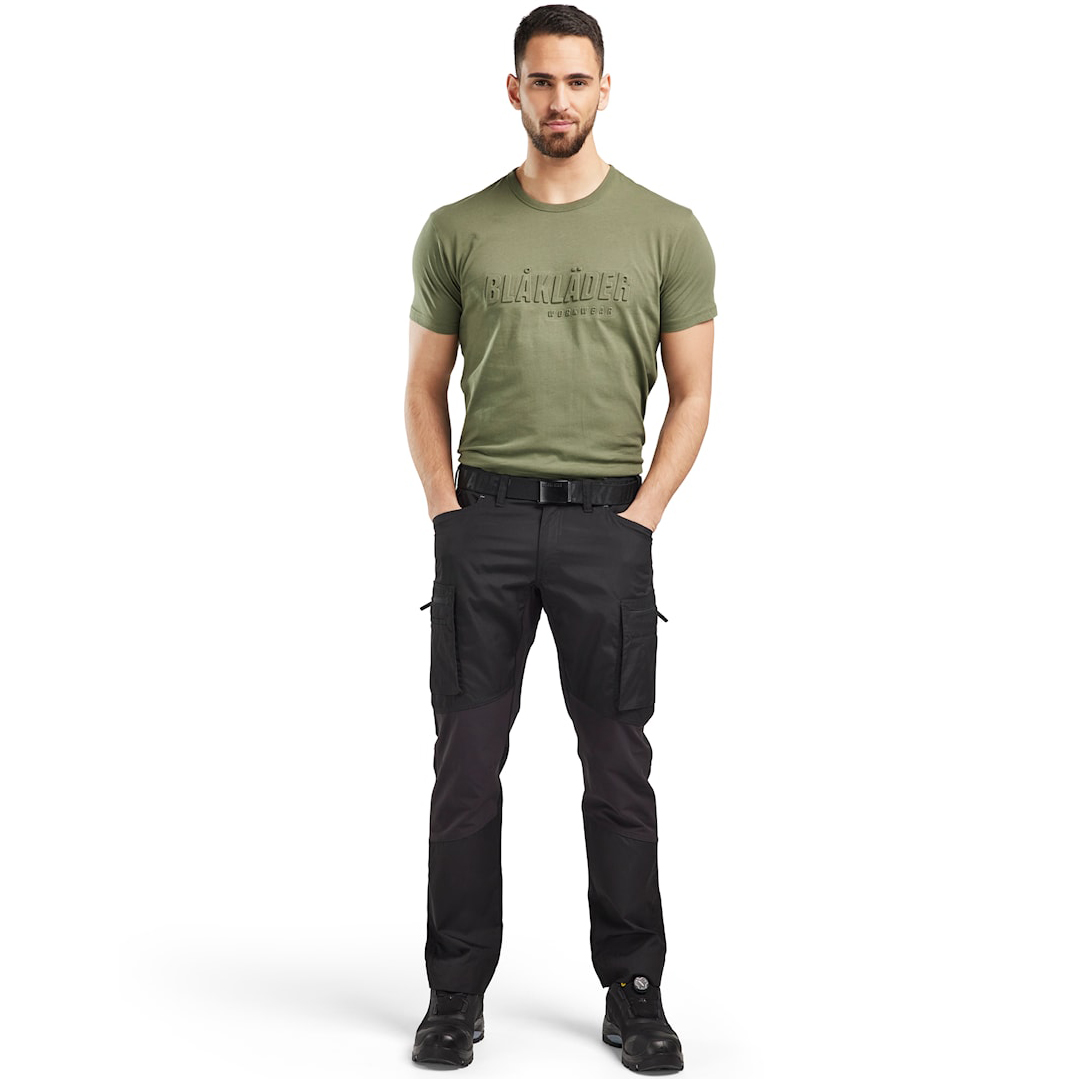 Stylové bavlněné tričko s výrazným 3D nápisem „Blakläder“ na hrudi je ideální volbou pro každodenní nošení v práci i ve volném čase. Díky volnějšímu střihu poskytuje maximální pohodlí a umožňuje volný pohyb. Vyrobeno ze 100% bavlny (jednoduchá pletená tkanina, 150 g/m2), což zajišťuje prodyšnost a příjemný pocit na těle. Tričko má kulatý výstřih s žebrovaným lemováním, zesílené ramenní a krční švy pro vyšší odolnost a dlouhou životnost. Stylový potisk „Blakläder“ v 3D provedení na hrudi podtrhuje váš vkus v pracovním oblečení a dodává tričku moderní vzhled.
