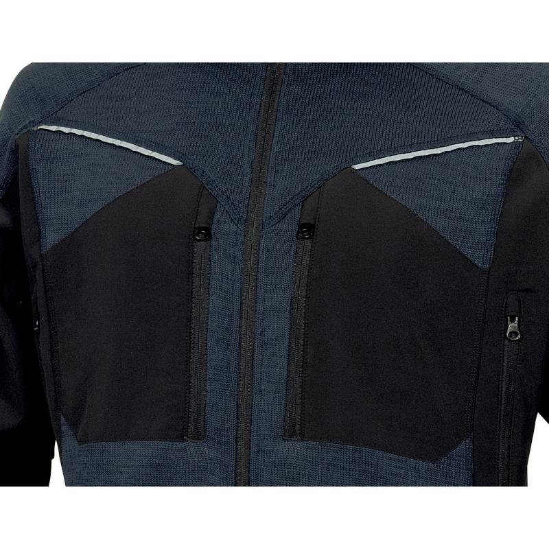 Pletená moderní a lehká. Zapínání na zip krytý lištou. Manžety a spodní část oděvu zakončena lemovkou. 6 kapes. Polyesterové švy. Vsadky: Cordura® a "Softshell" 96% polyester 4% elastan. Podšívka límce z polar fleecu Velmi pohodlné nošení, optimalizovaná ochrana proti chladu. Dekorativní reflexní pásky (vpředu a na rukávech)