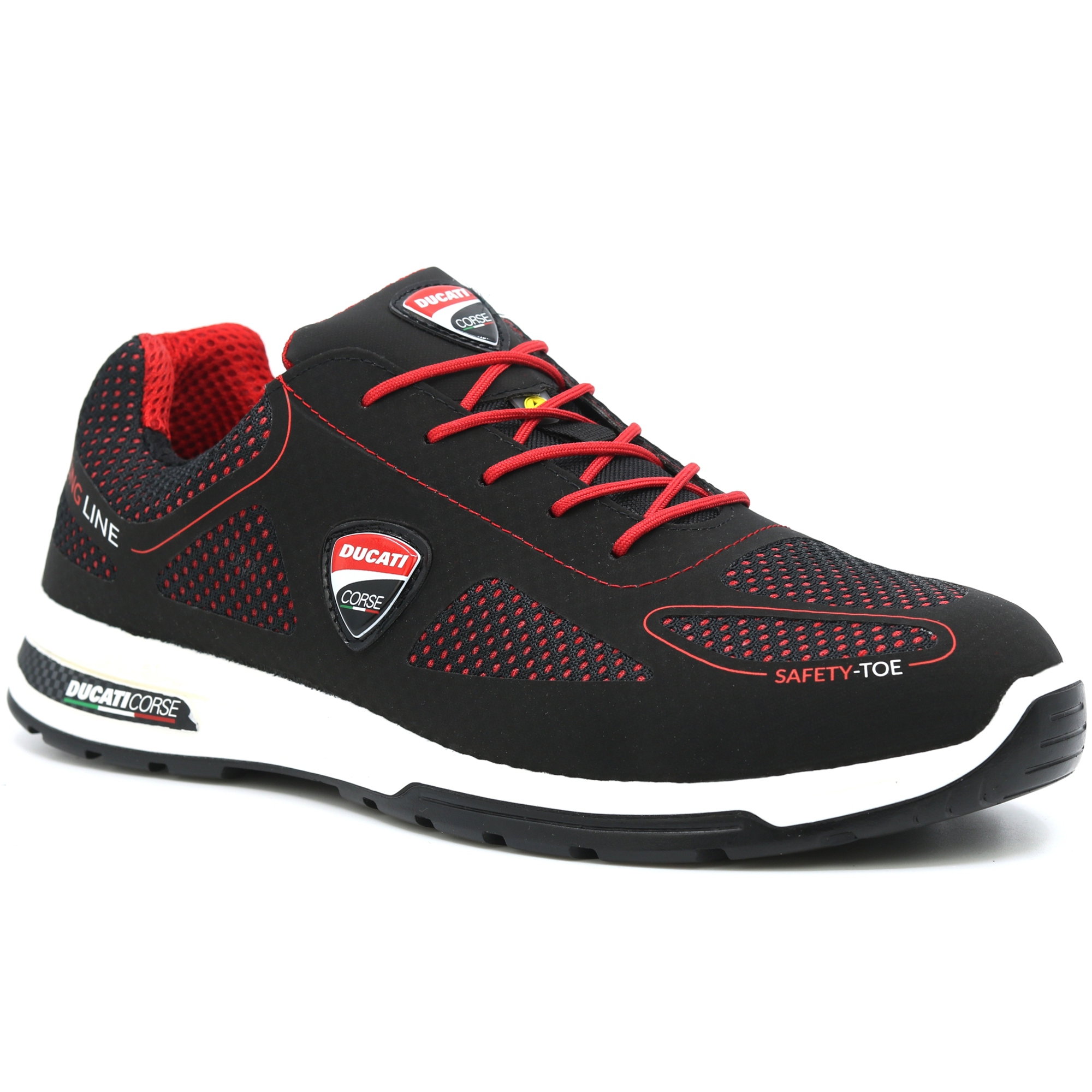 Bezpečnostní obuv Ducati-FTG Estoril S1P SRC, je krásná na pohled a pohodlné na nošení; Studie designu, vysoce kvalitních materiálů, italští pracovníci se zkušenostmi dávají vzniknout výjimečnému produktu pro svět práce! Zde jsou Estoril jako celek: svršek z černé mikrovlákna-MESH s polstrováním, které zvyšuje bezpečnost a pohodlí, ESD obuv zvláště vhodná pro použití v mikroelektronickém průmyslu, montáži mikročipů a transitorech; elektřina nashromážděná během chůze je neustále rozptylována na zemi a vyhýbá se takzvanému „šoku“ 100% polyesterová podšívka, prodyšná, opracovaná voština, která vypuzuje pot a udržuje nohu chladnou a suchou, Total Metal Free, bez použití kovu ve všech komponentech, vhodný pro použití v prostředích s detektory kovů, stélka ESD Sport-Lite, prodyšná, z pěny s vysokou hustotou otevřených buněk. Podešev SPORT z polyuretanu s dvojitou hustotou, ohebná, s vysokou odolností proti oděru, vodě a oleji. Stélka z nekovové HRP fólie s vysoce houževnatými, voskem potaženými vrstvami plazmy. THIN CAP odolný vůči nárazům do 200 J, lehký, nemagnetický a atermický. EN ISO 20345 - BEZPEČNOSTNÍ OBUV