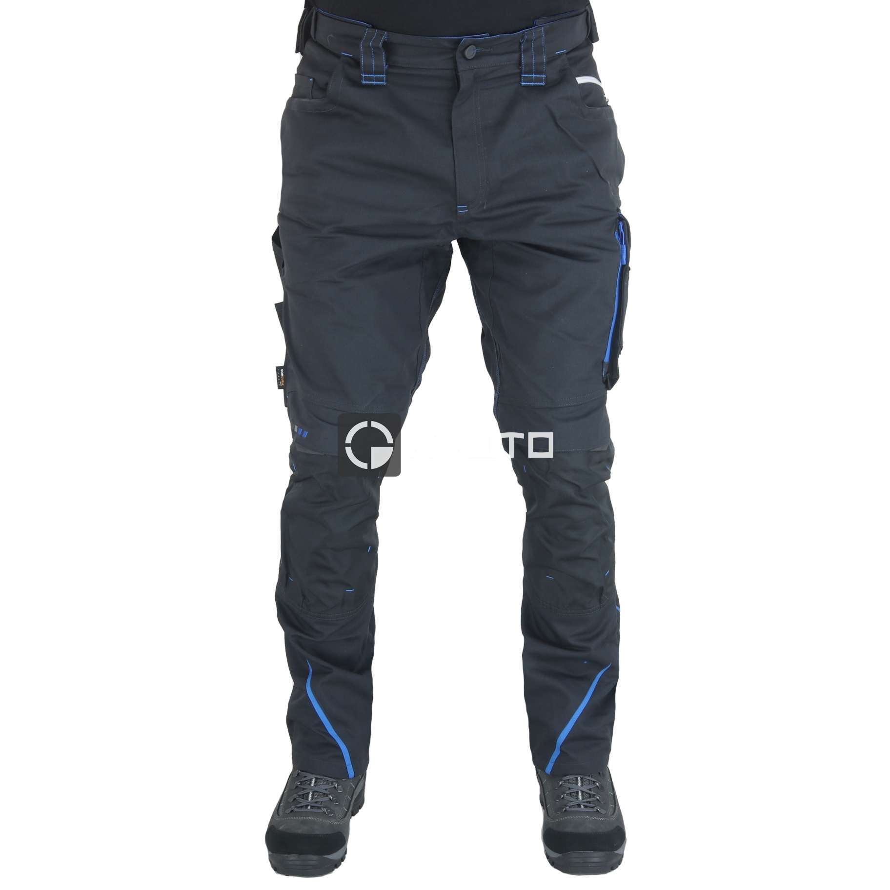 Ergonomický střih s moderní sportovní siluetou, postranní elastický pásek Flexbelt®, uvnitř mírně zdrsněný, extra pevný trojitý šev u vnitřních nohavic, široká poutka na opasek se suchým zipem na řemeslnickou brašnu, 2 zásuvné a 2 zadní kapsy zesílené materiálem CORDURA®, zesílená funkční kapsa na skládací metr a několikadílná stehenní kapsa. Oboustranné odvětrání se zipem na stehnech vzadu, vypolstrovaná kolenní kapsa nahoře se suchým zipem, kolenní partie z robustního materiálu CORDURA® Decentní odrazky. Svrchní materiál