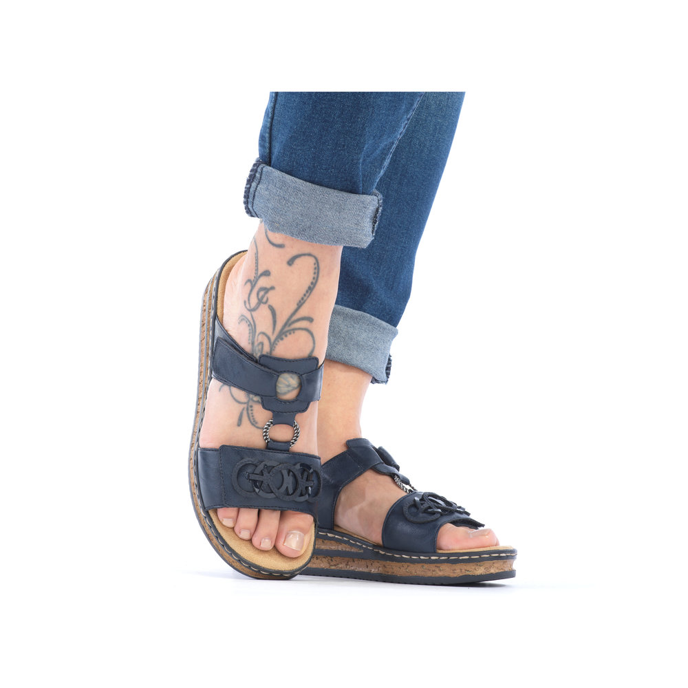Tento dámský nazouvák značky RIEKER ocení každá žena, která má ráda jednoduchou eleganci. Tmavě modrý svršek je na předním pásku ozdoben aplikací v podobě spletených kruhů, zatímco kovový prvek spojuje přední a nártovou část a dodává botě sofistikovaný vzhled. Oba pásky jsou opatřeny suchým zipem, což umožňuje snadné nastavení podle individuálních potřeb. Měkká stélka je vyrobena z příjemného materiálu, který poskytuje maximální pohodlí při každém kroku. Stylová podešev s korkovým detailem a černými pruhy dotváří celkový vzhled sandálů k dokonalosti. Tyto nazouváky se skvěle hodí k dlouhým sukním i šatům, ať už na běžné nošení nebo speciální příležitosti.