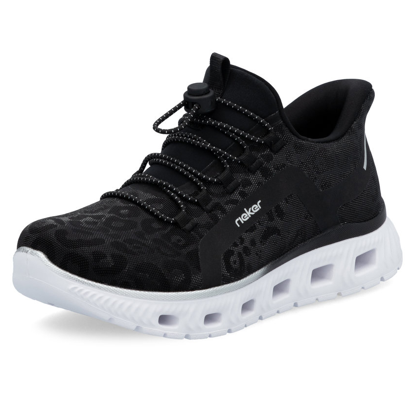 Tento model od RIEKER dokonale spojuje moderní design s maximálním pohodlím, což z něj činí ideální volbu pro každodenní nošení. Černý svršek s elegantním vzorem je doplněn pružným lemem a šněrováním na gumičku, které zajistí optimální přizpůsobení a snadné nazouvání. Lehká a flexibilní podešev poskytuje vynikající tlumení nárazů a podporuje přirozený pohyb nohy, což oceníte při celodenním nošení. Unikátní stélka MemoSoft z paměťové pěny se dokonale přizpůsobí tvaru chodidla a poskytuje měkký došlap pro maximální komfort. Díky technologii Antistress jsou boty mimořádně lehké, flexibilní a nabízejí dostatečný prostor pro přirozený pohyb nohou, zatímco systém Ready2GO umožňuje snadné nazutí bez nutnosti použití rukou. Tento model je ideální pro ty, kteří hledají stylové, ale zároveň funkční a pohodlné obutí pro každodenní nošení.