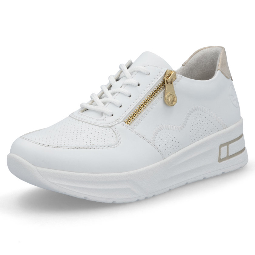 Objevte dokonalé spojení stylu a pohodlí s bílými teniskami RIEKER, které zaujmou svým elegantním zpracováním a sofistikovanými detaily. Jemná perforace na svršku nejen podtrhuje moderní vzhled, ale také zajišťuje optimální prodyšnost. Zlatý detail na patě dodává obuvi luxusní akcent, zatímco šněrování v kombinaci s funkčním zipem umožňuje snadné obouvání a dokonalé přizpůsobení chodidlu. Flexibilní podešev poskytuje měkký došlap a maximální komfort při chůzi, zatímco vyjímatelná stélka se přizpůsobí vašemu kroku. Tyto tenisky jsou ideální volbou pro ženy, které hledají módní a pohodlnou obuv pro každodenní nošení.